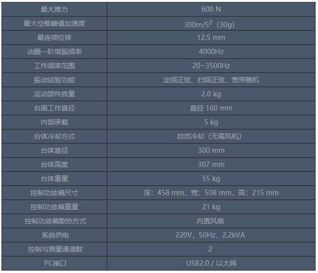 桌面上的振動臺。220V供電。自然冷卻(無需風機)。適合2kg以下試件。正弦、隨機振動。主要技術(shù)參數(shù)表